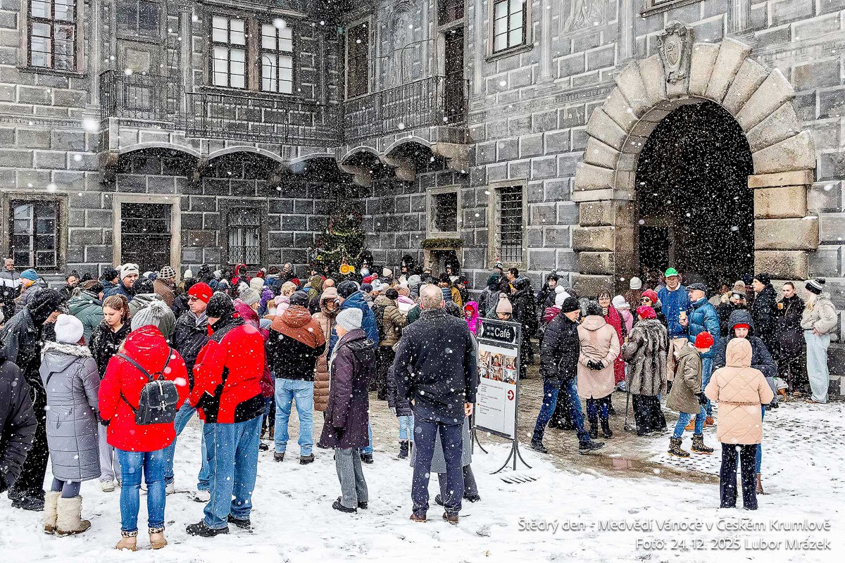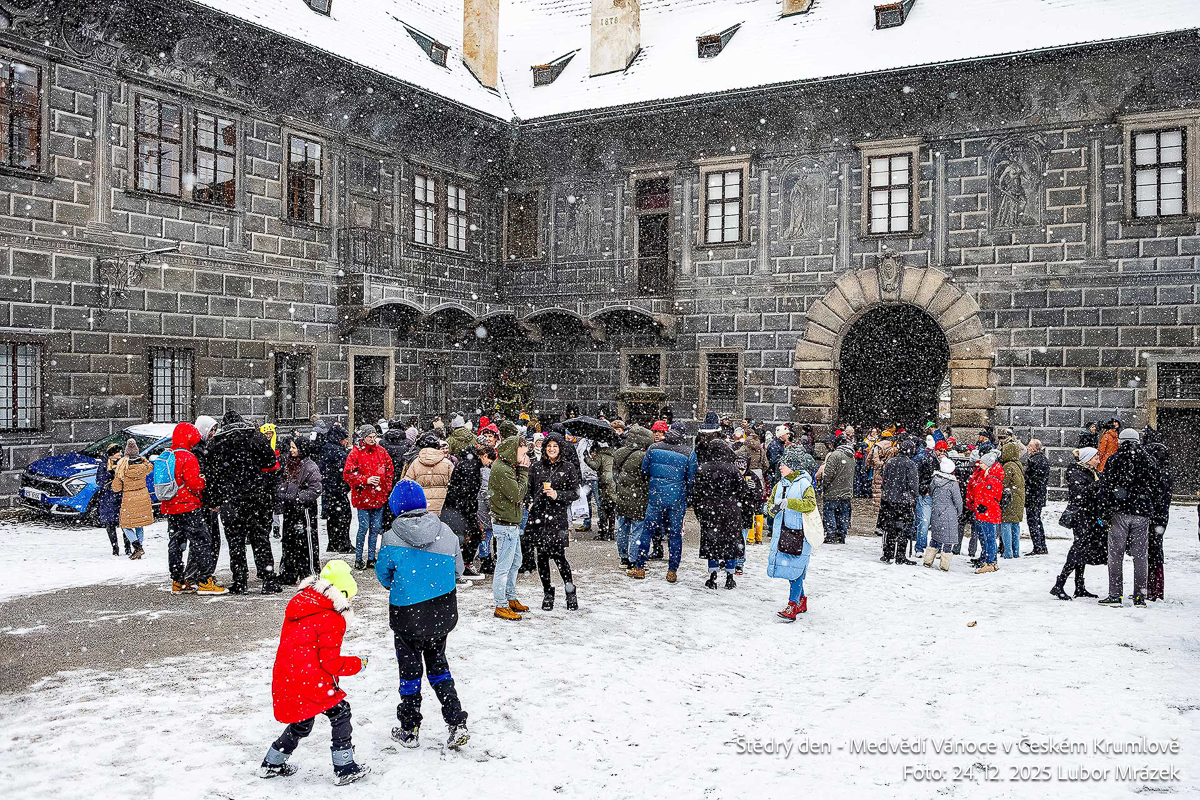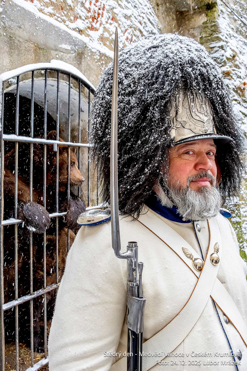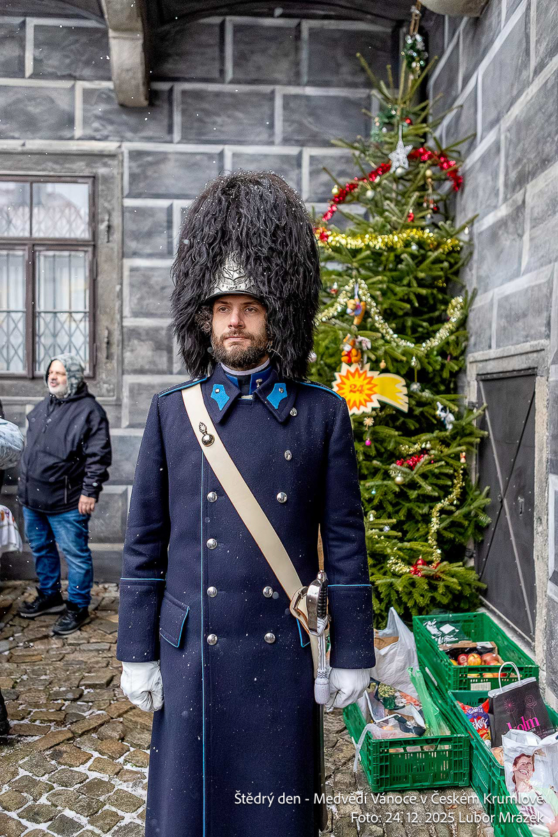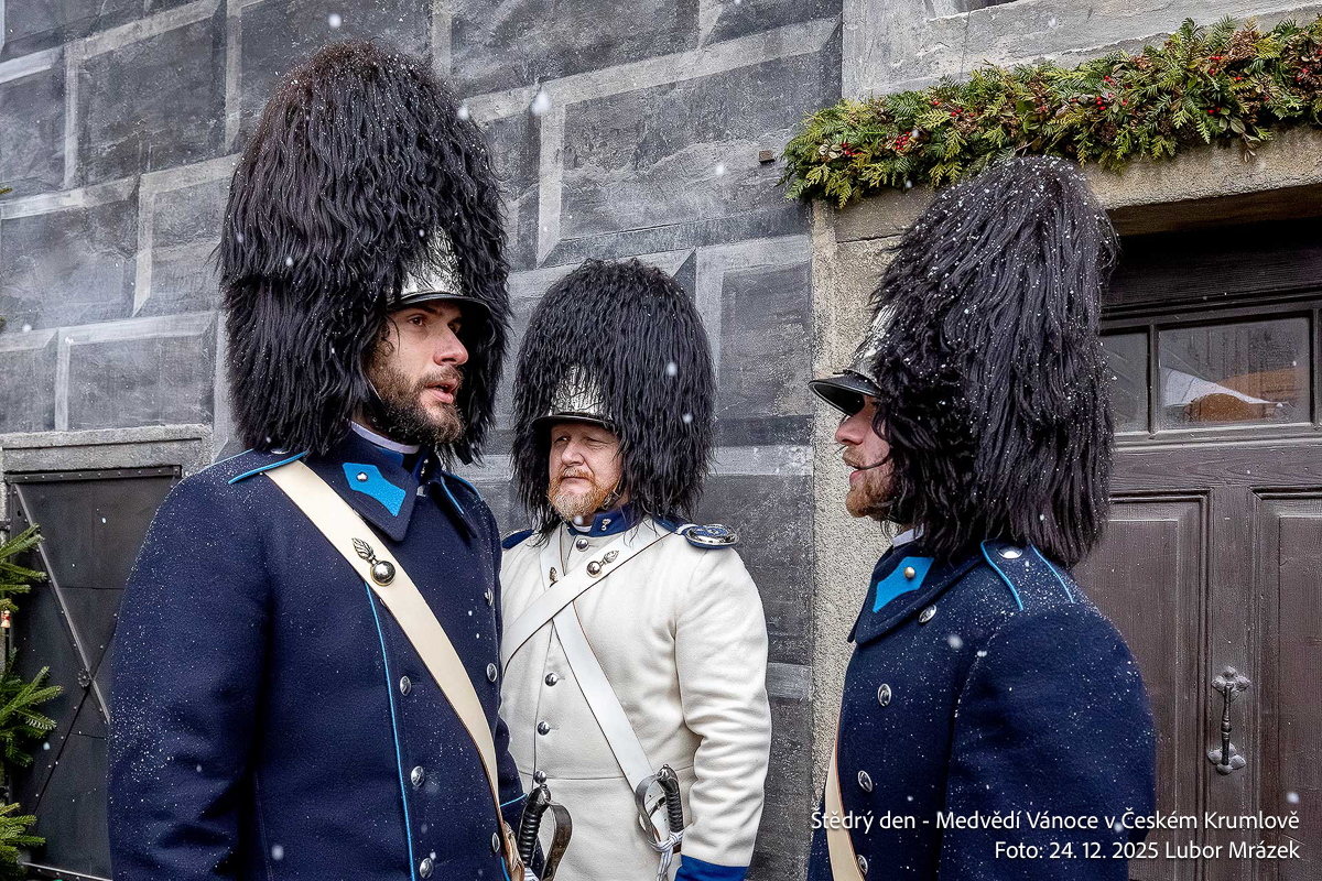 Na Štědrý den LP 2025 zažil Krumlov po mnoha letech vskutku pravé ladovské Vánoce. Při ranním nástupu granátníků, kteří jako každý rok zajistili ostrahu medvědího příkopu, začal padat první sníh – a v poledne, kdy gardoví trubači vytrubovali ze zámecké věže vánoční koledy, byly již všechny střechy ve městě oblečeny do bílého kabátu. Mnohokrát děkujeme všem Krumlovským i přespolním, že dorazili na Gardeplac podpořit krásnou tradiční akci, a rovněž i všem těm, kteří ze zasněženého Krumlova potleskem povzbuzovali granátníky na věži v jejich vánočním vytrubování.