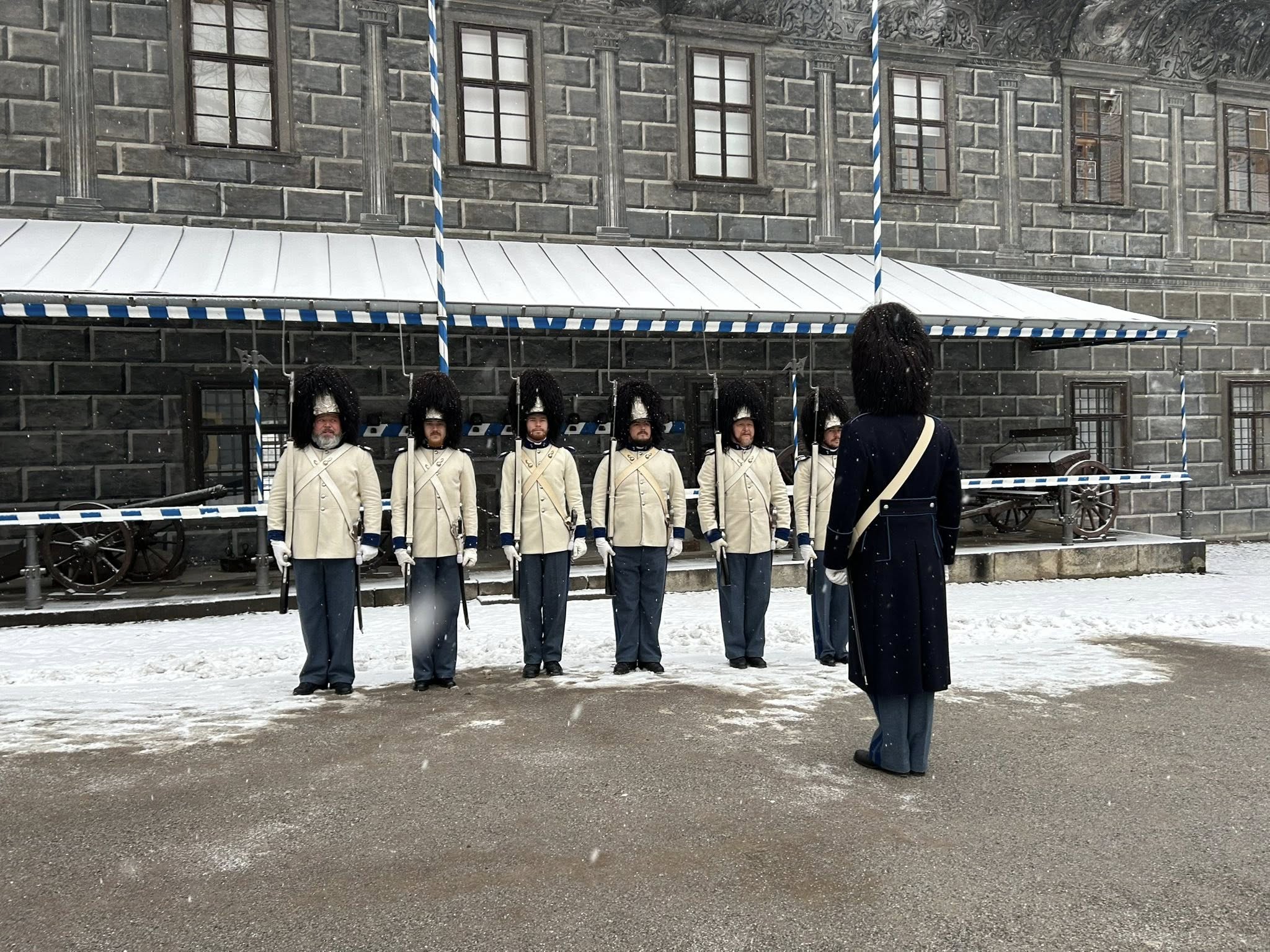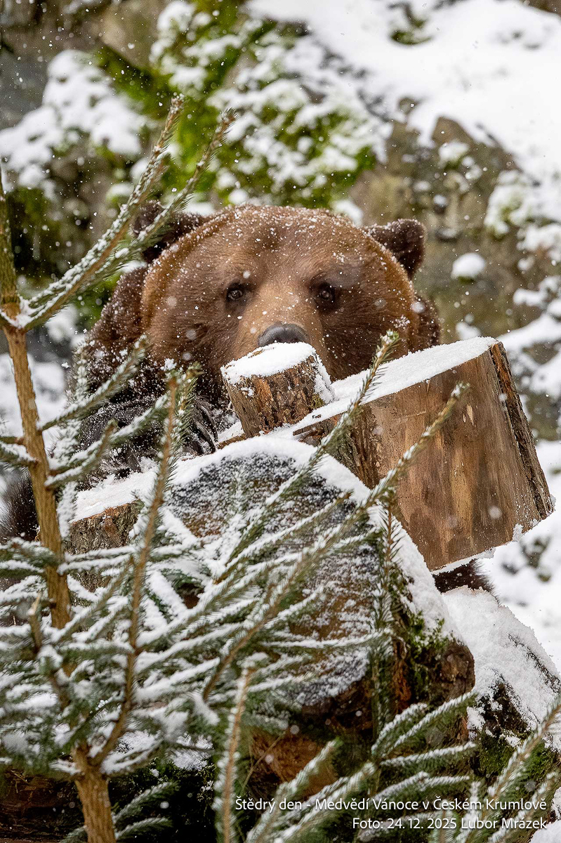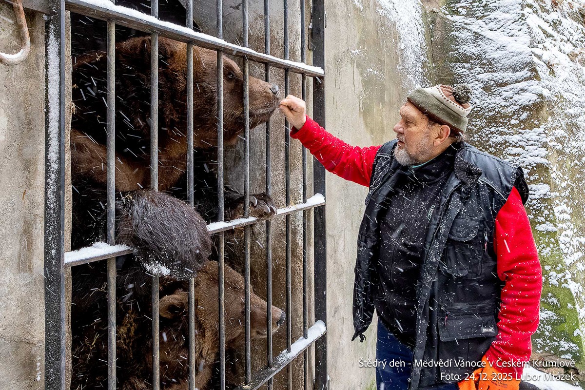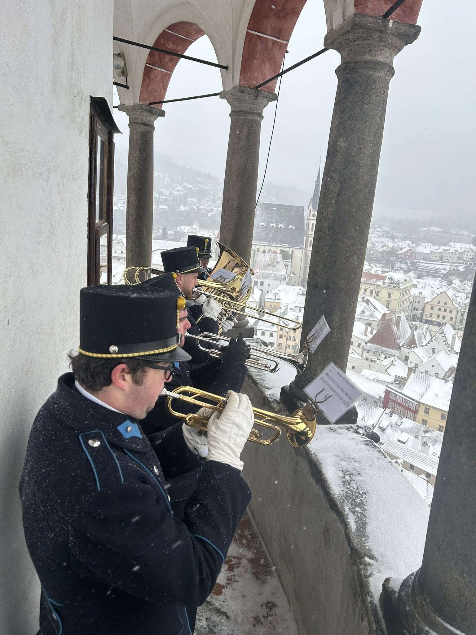 Na Štědrý den LP 2025 zažil Krumlov po mnoha letech vskutku pravé ladovské Vánoce. Při ranním nástupu granátníků, kteří jako každý rok zajistili ostrahu medvědího příkopu, začal padat první sníh – a v poledne, kdy gardoví trubači vytrubovali ze zámecké věže vánoční koledy, byly již všechny střechy ve městě oblečeny do bílého kabátu. Mnohokrát děkujeme všem Krumlovským i přespolním, že dorazili na Gardeplac podpořit krásnou tradiční akci, a rovněž i všem těm, kteří ze zasněženého Krumlova potleskem povzbuzovali granátníky na věži v jejich vánočním vytrubování.